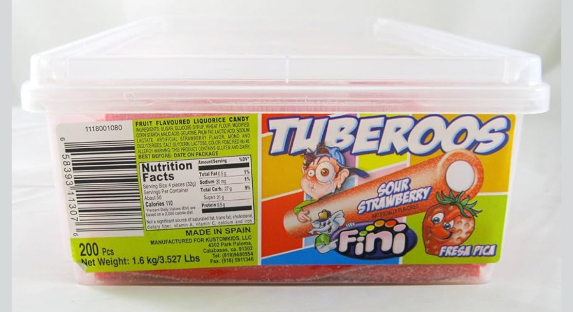 These are an all time favorite. Kids loves sour belts. Each tuberoo is covered in sour sugar and filled with white fondant. They will certainly deliver a swift punch to the palate with every bite.